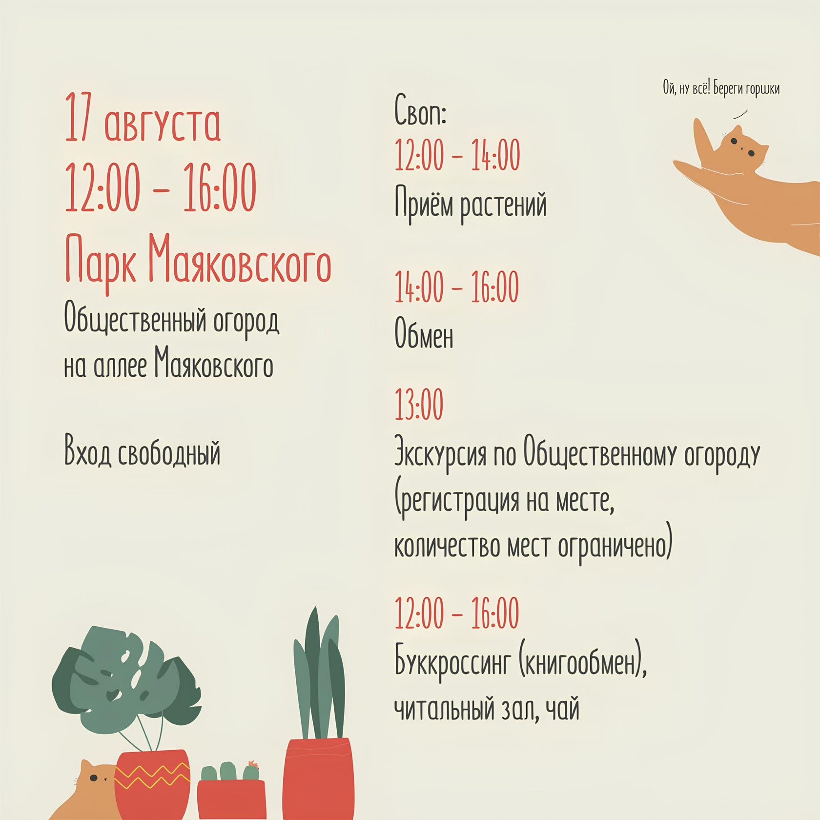 🪴 С 12:00 до 14:00 на газоне у Общественного огорода будем принимать растения на обмен, а с 14:00 — начнём сам обмен. Для участников подготовлены столы обмена за фишки и столы свободного обмена. Чтобы получить фишки, приносите свои растения из дома — кстати, мы принимаем фишки любых городских свопов комнатных растений.
