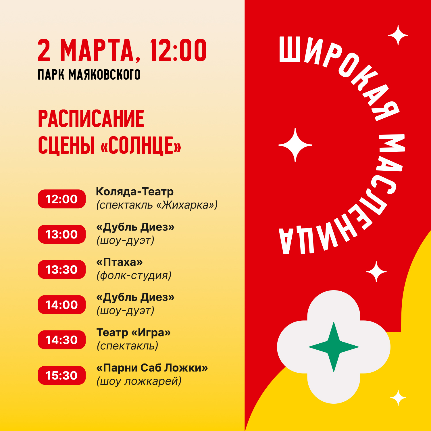 ☀️ На Широкой Масленице всех гостей ждёт много музыки и танцев! Сцена «Солнце» зарядит весенним настроением сразу у центрального входа ❤️